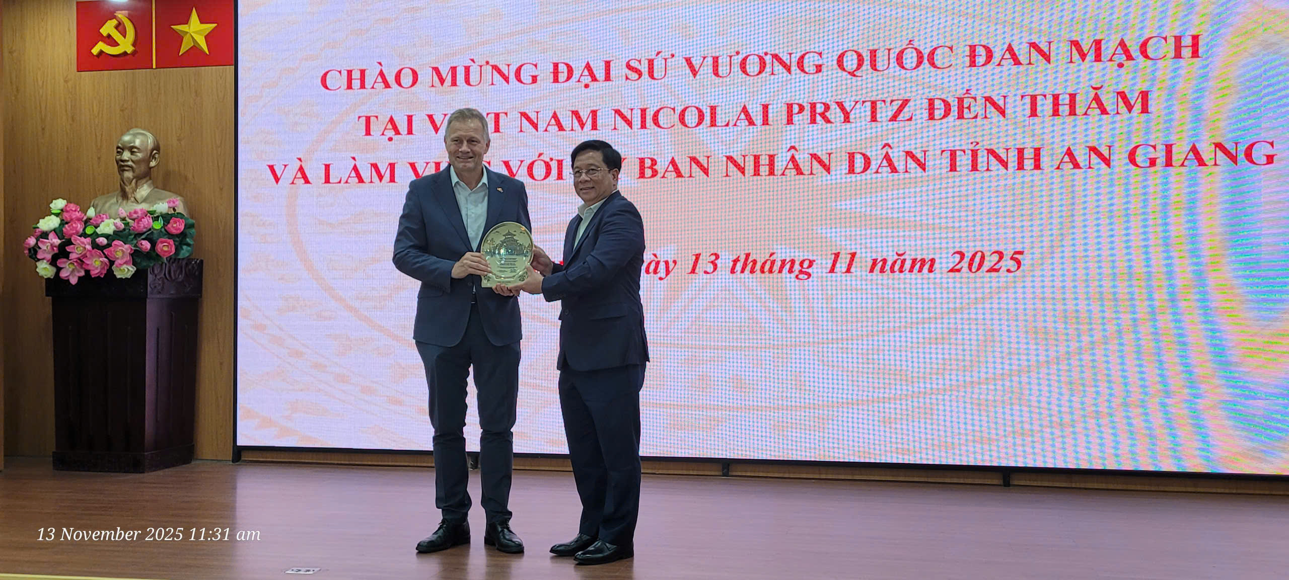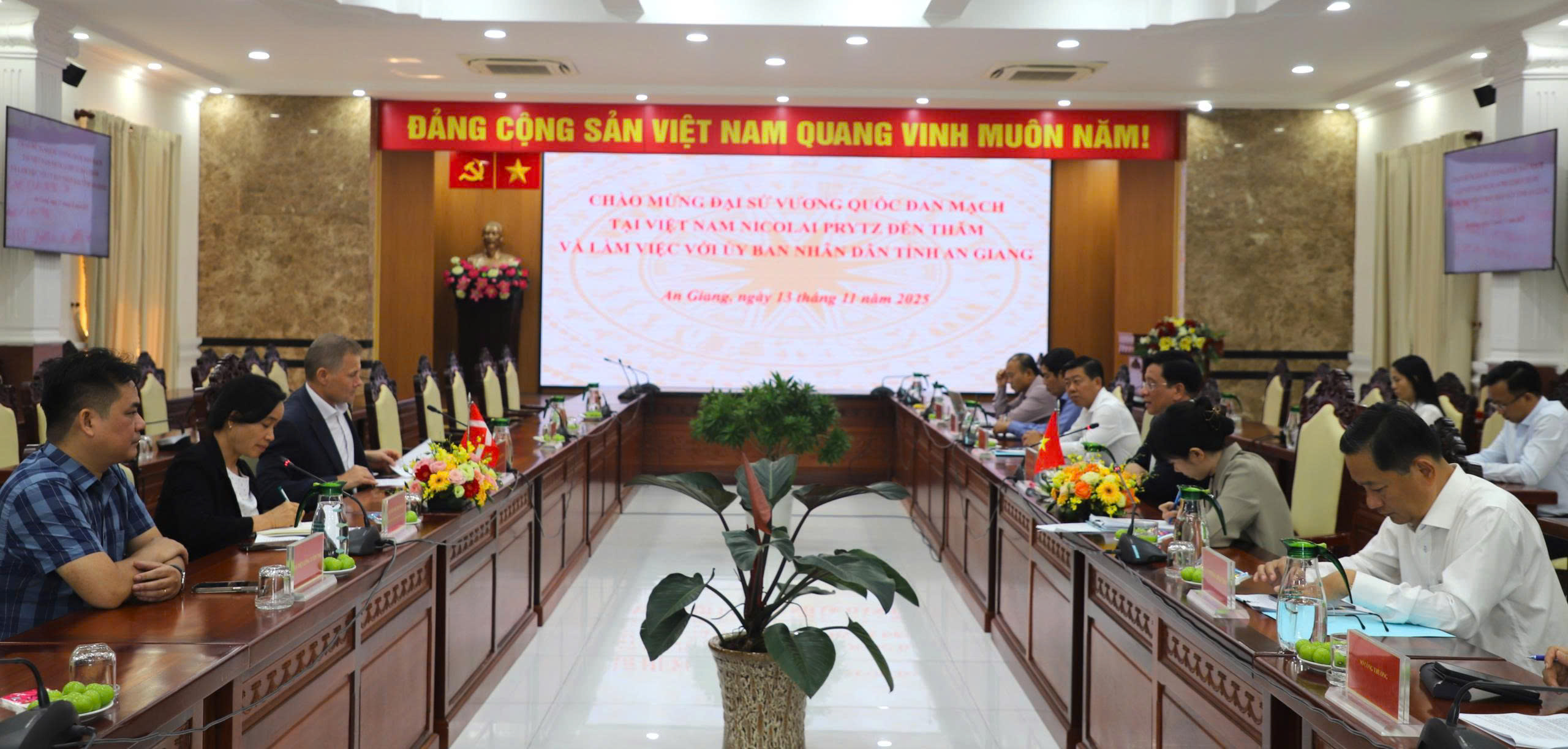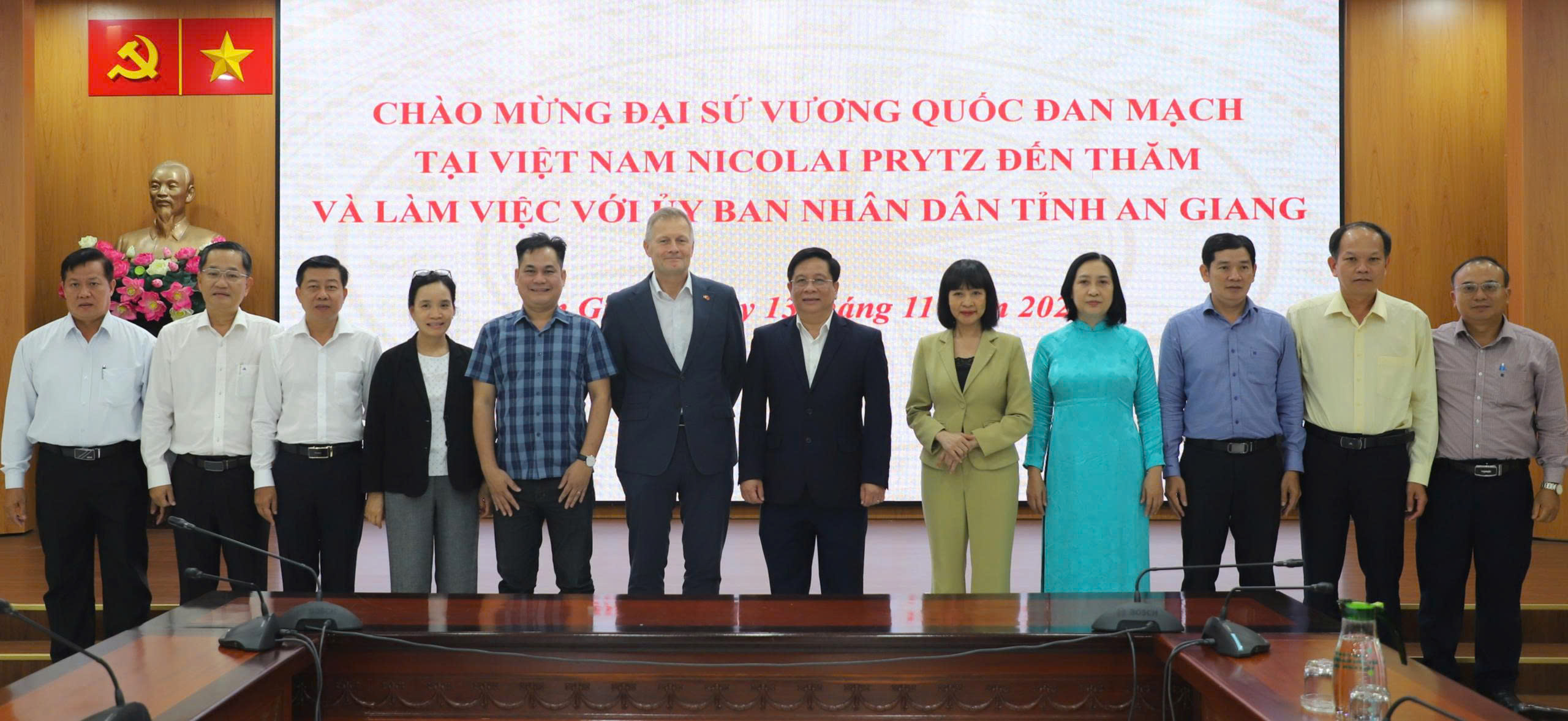 Sáng ngày 13/11, ông Hồ Văn Mừng, Chủ tịch UBND tỉnh An Giang cùng đại diện các sở, ban, ngành có buổi tiếp và làm việc với Đoàn công tác của Đại sứ quán Đan Mạch tại tỉnh An Giang (Việt Nam), Đoàn công tác do Ngài Nicolai Prytz, Đại sứ Đan Mạch dẫn đầu. Buổi làm việc nhằm thảo luận các phương hướng thúc đẩy mối quan hệ hợp tác giữa các đối tác Đan Mạch với tỉnh An Giang, đặc biệt là trong các lĩnh vực: năng lượng tái tạo, kinh tế xanh, kinh tế tuần hoàn và du lịch.